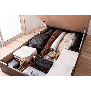 開閉スペースが必要な引出し収納とは違い、床板ごと開閉できるので、省スペースで大量収納が可能な跳ね上げ式。