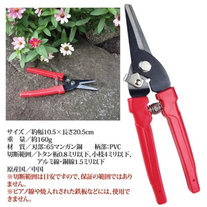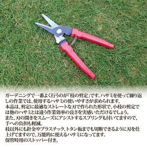ガーデニングで一番よく行うのが「枝の剪定」です。ハサミを使って繰り返しの作業では、使用するハサミの使いやすさが求められます。本品は、剪定に最適なストレートな刃で作られた形状で、小枝の剪定では他のハサミとは違う作業効率の良さを実感いただけるでしょう。また、刃の開きをスムーズにアシストするスプリングも付いてますので、手への負担も軽減。枝以外にも針金やプラスチック、トタン板までも切断できるように刃を仕上げてますので、万能的に使えるハサミになってます。保管時用のストッパー付き。